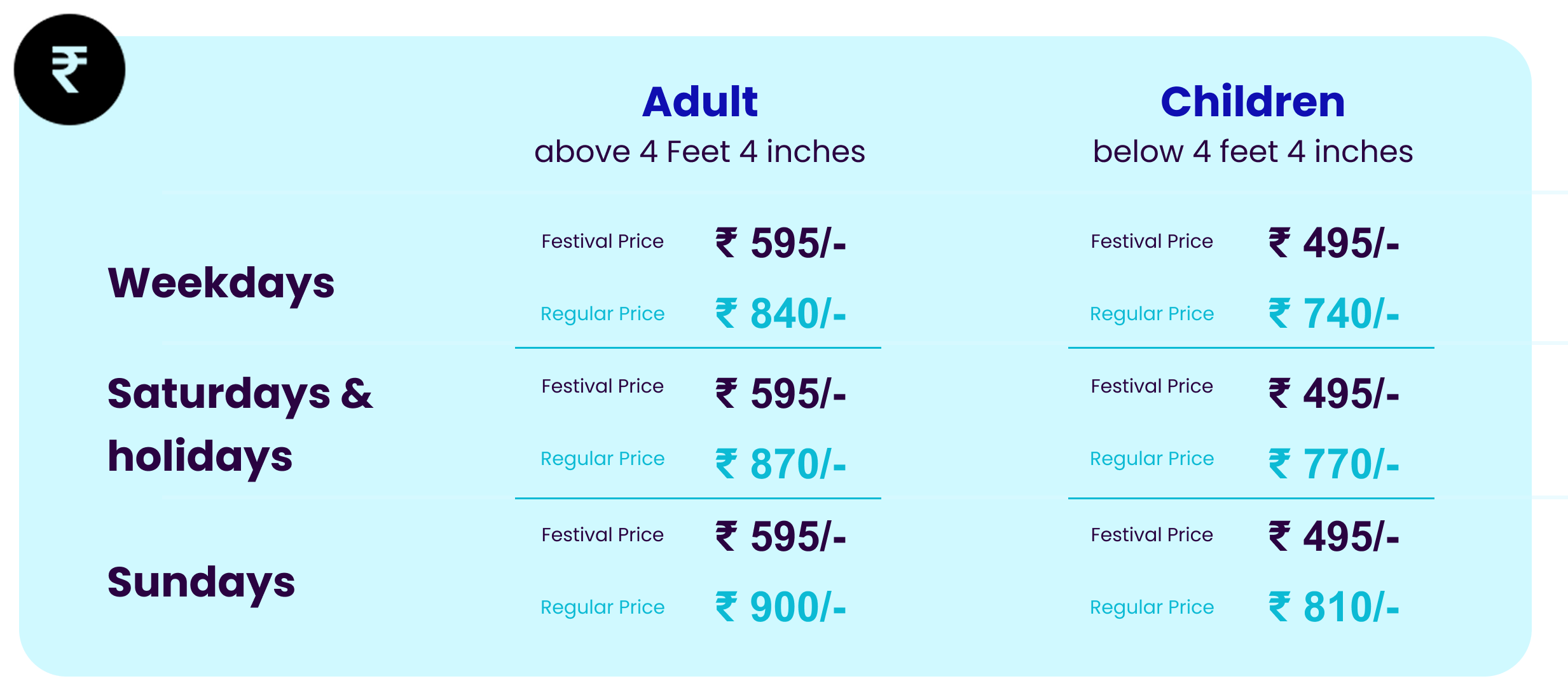 Pricing Plan Your Visit Enjoy unlimited access to all rides (except Bumper Car, Cine Magix & Vortex Maze) with affordable entry fees tailored for adults and children. * Locker Deposit is ₹ 170 & Rent is ₹ 140. Entry prices subject to change without notice • Ticket Price is inclusive of 18% GST• Bands once purchased cannot be returned• Food & Drinks from outside are not allowed• Rights of admission reserved• Tickets available at our ticket Counter